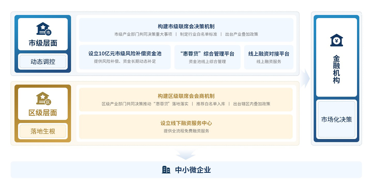 通過構(gòu)建市級(jí)聯(lián)席會(huì)決策機(jī)制、設(shè)立10億元市級(jí)風(fēng)險(xiǎn)補(bǔ)償資金池、開發(fā)“惠蓉貸”綜合管理平臺(tái)、搭建線上融資對(duì)接平臺(tái)形成市級(jí)層面動(dòng)態(tài)調(diào)控。